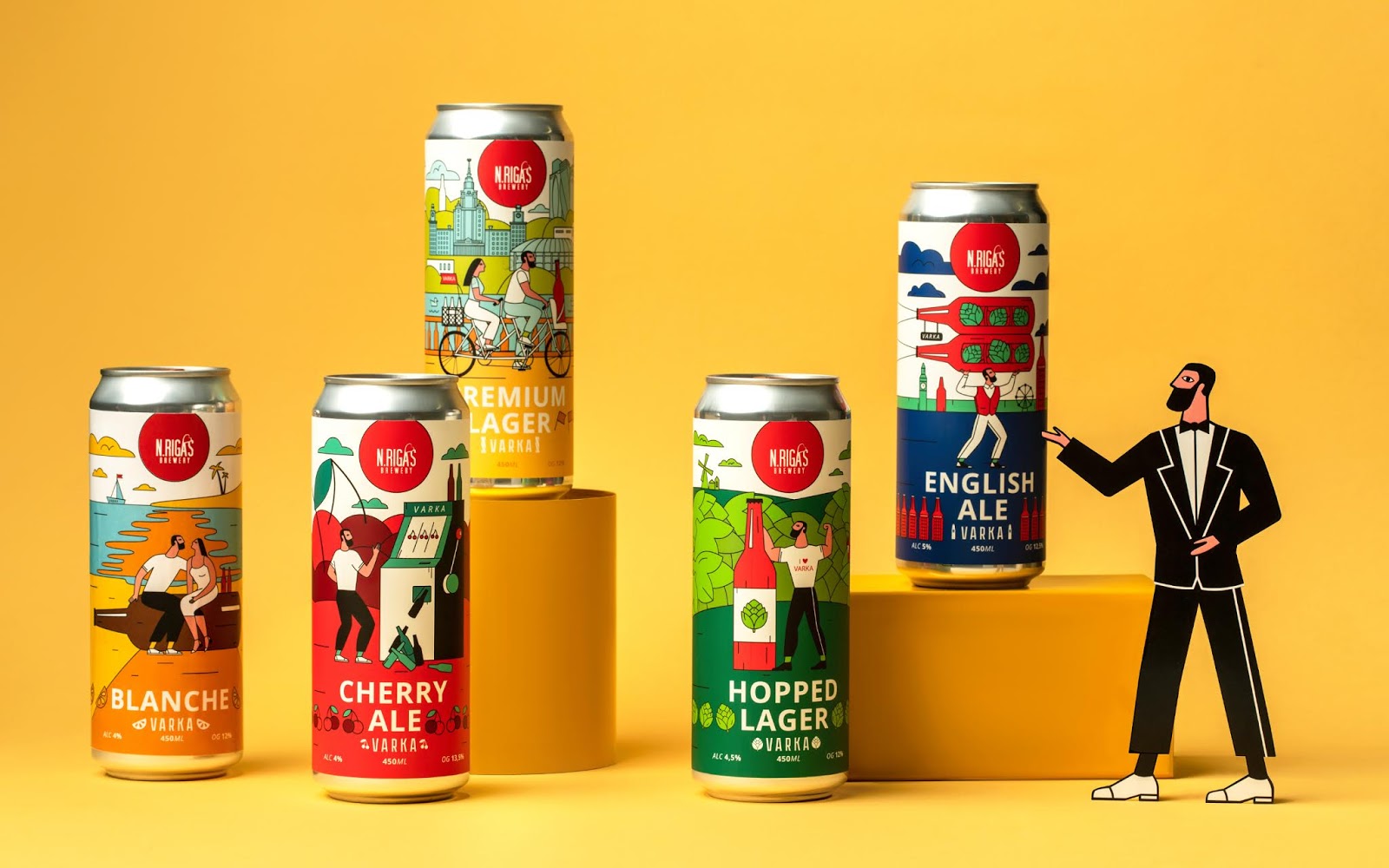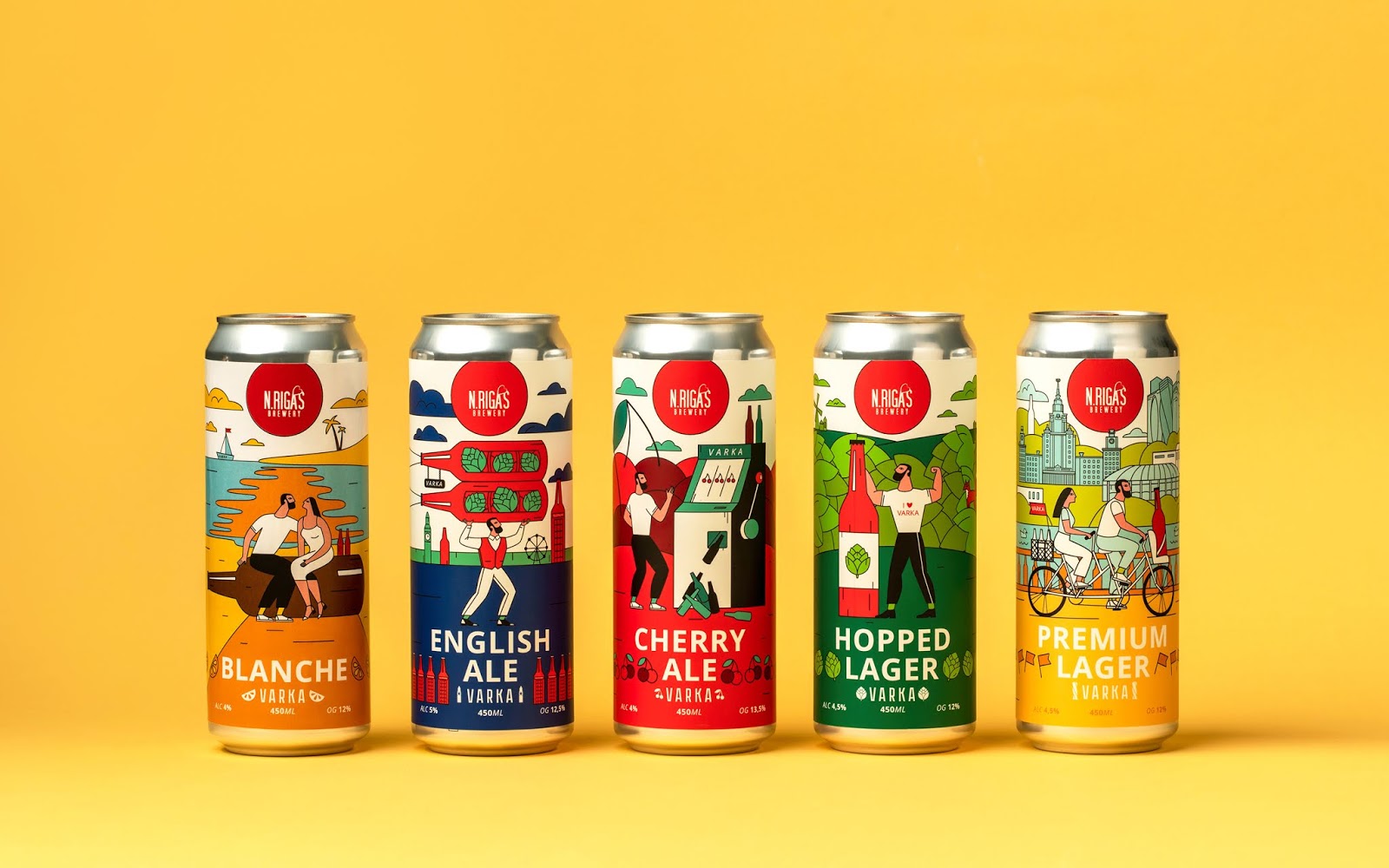 這是VARKA啤酒包裝設計,使用當下比較流行的插畫形式,描繪了商品在生活中的使用場景,用多種艷麗的顏色烘托出正向、多姿多彩的氛圍。