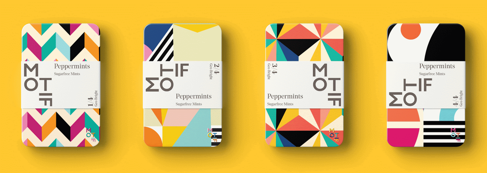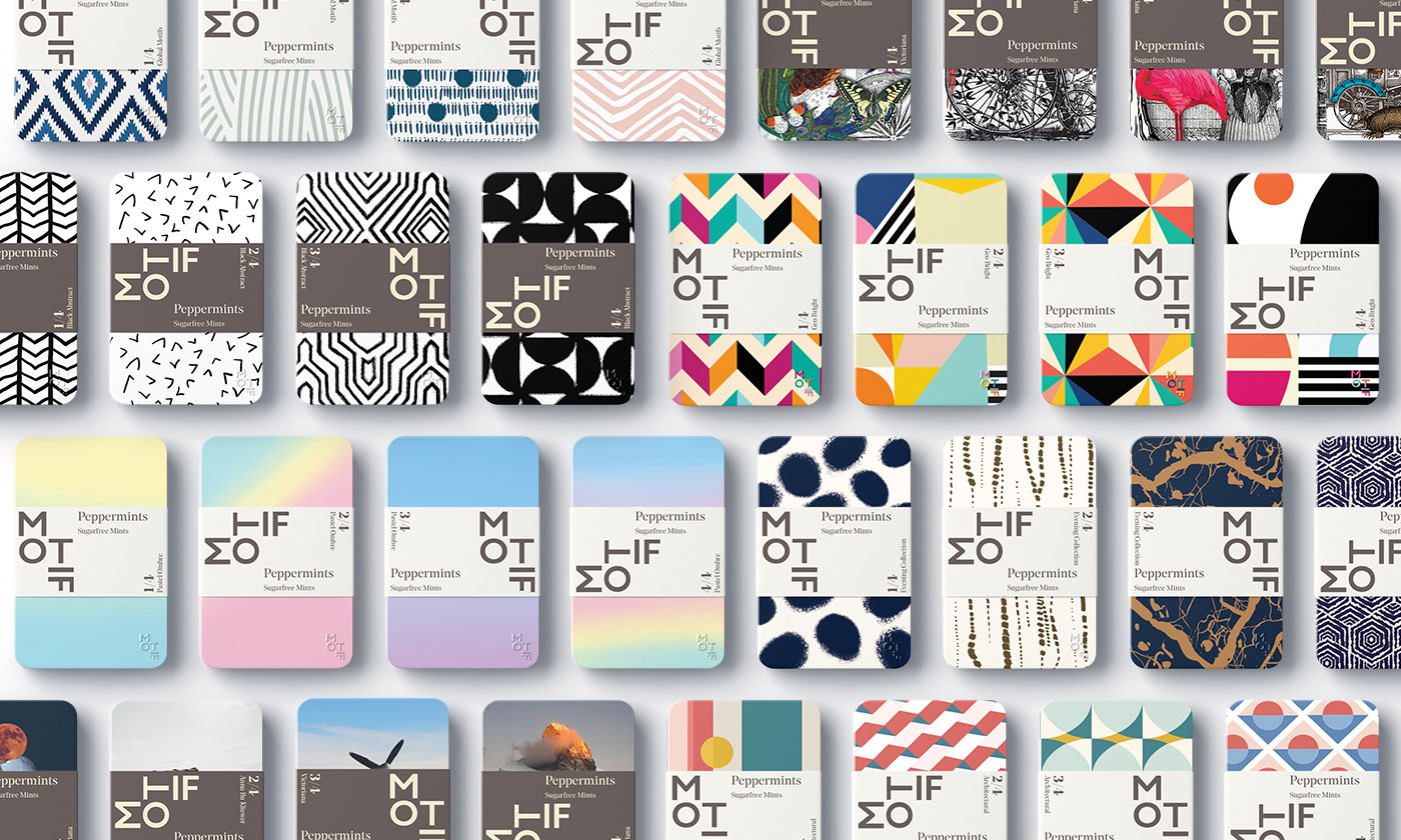 Motif薄荷糖包裝設計,使用抽象的幾何元素與風景人物進行換位的方式,突出了薄荷糖,口味刺激多變的特點。
